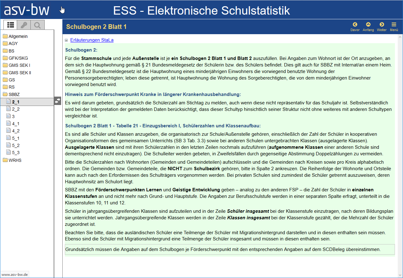 Validierungsfehler werden in dem beschriebenen Validierungsdialog angezeigt. Eine Behebung der Validierungsfehler erfolgt entweder durch Korrektur der Daten in ASV-BW (automatischer Betriebsmodus der ESS 2.0) und erneute Übertragung der geänderten Daten nach der ESS 2.0 bzw. durch manuelle Korrektur der fehlerhaften Daten durch direkte Änderung in den betroffenen Statistikbögen (manueller Eingabemodus der ESS 2.0).