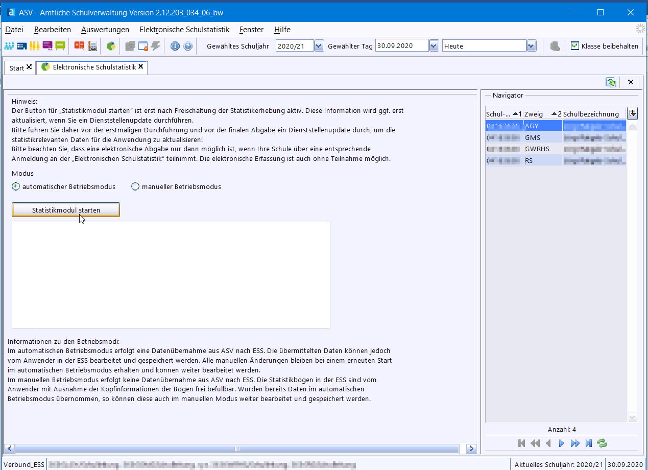 Bei der Vorabplausibilisierung in ASV-BW bitte beachten, dass bei jedem Aufruf der ESS 2.0 im automatischen Betriebsmodus alle Schulzweige des Verbunds geprüft werden. Erst wenn alle Schulzweige fehlerfrei sind, startet die ESS-Anwendung: