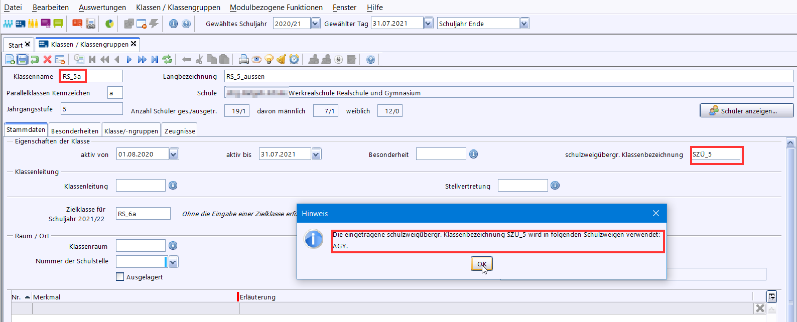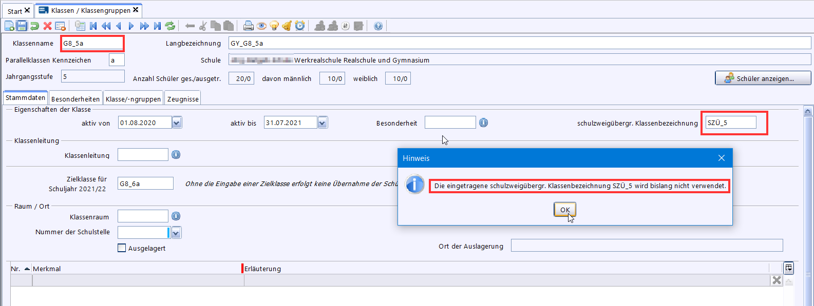 Für die korrekte Abbildung schulzweigübergreifender Unterrichtsgruppen innerhalb der ESS müssen alle beteiligten Klassen in den unterschiedlichen Schulzweigen eine eindeutige schulzweigübergreifende Klassenbezeichnung haben. Diese wird im Modul Klassen auf dem Reiter Stammdaten eingegeben:
