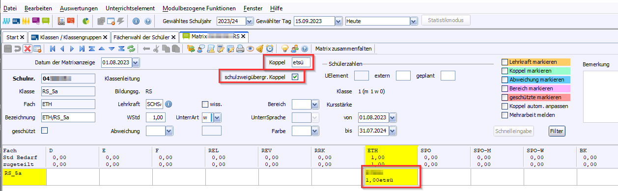 In der Matrix können dann Koppeln in Unterrichtsgruppen mit dem Merkmal schulzweigübergr. Koppel gebildet werden: